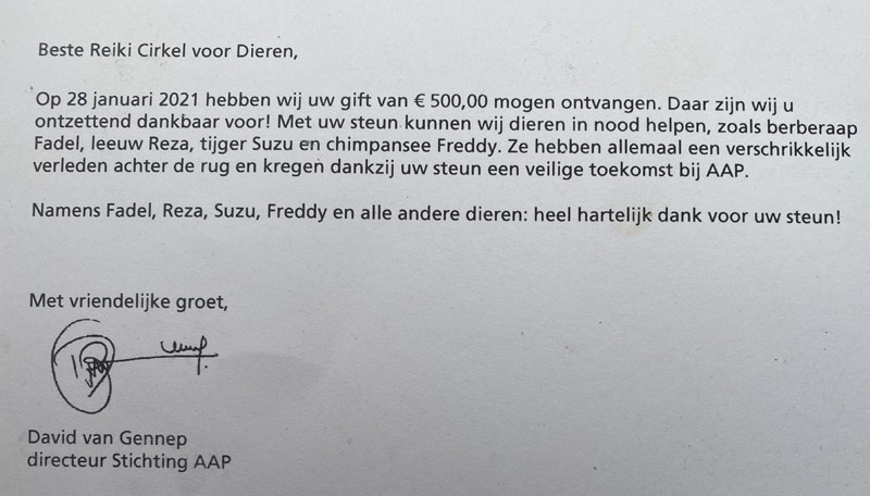 Namens alle dieren, de Stichting Dierenlot en de leden van de Reikicirkel: heel hartelijk bedankt!